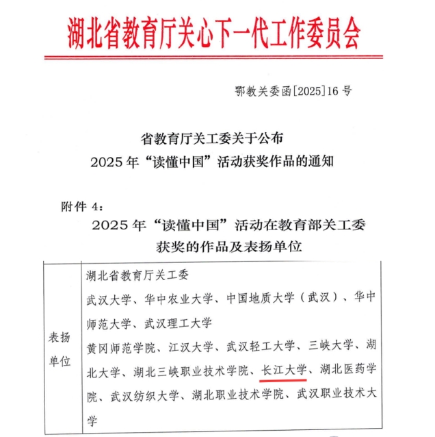 近日,湖北省教育厅关工委公布2025年“读懂中国”活动获奖作品名单,mk网页版登录入口作品喜获多项荣誉,共获评“最佳征文”4篇、“优秀征文”1篇、“最佳微视频”1部、“优秀微视频”1部,学校获教育部关工委表扬单位。