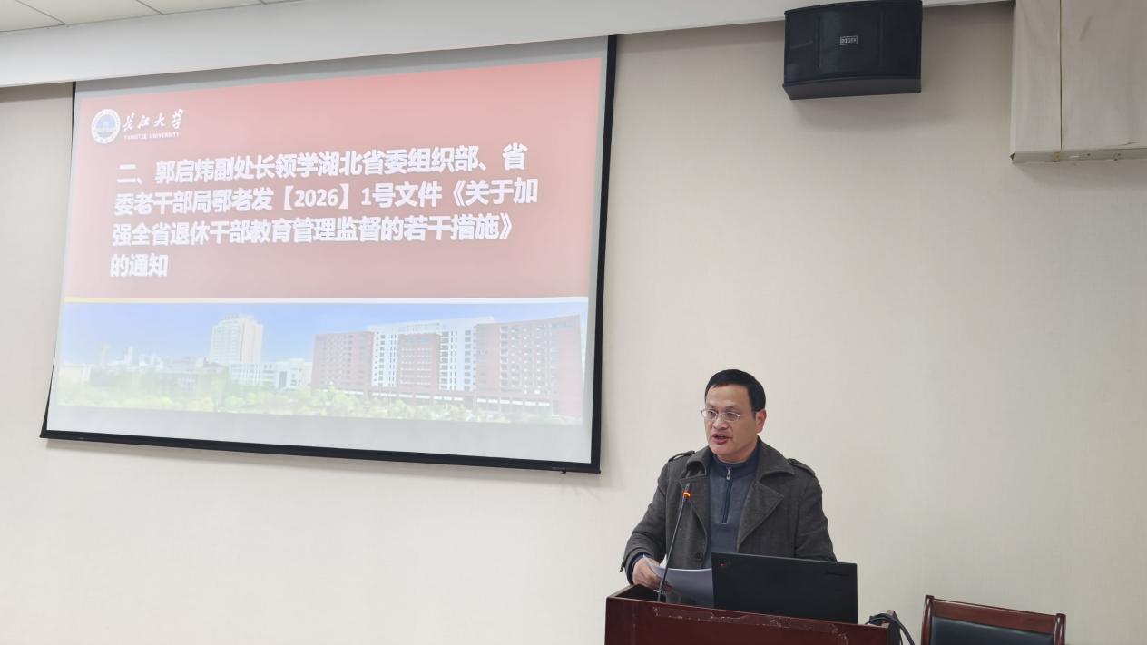 围绕加强老同志纪律教育,张涛解析了《若干措施》20条的核心要义及精神,结合实际强调老同志们要切实增强学纪、知纪、明纪、守纪的思想自觉和行动自觉,仔细算算“经济账、名誉账、时间账”,严禁酒驾醉驾、不得违规打牌赌博、规范网络行为严守底线、出国(境)和婚丧喜事等事项认真按要求报告及其他工作。张涛号召动员有意愿有能力有特长的退休干部积极参加“夕阳如歌享天伦,为霞满天映支点”主题活动,为学校事业高质量发展贡献银发力量。